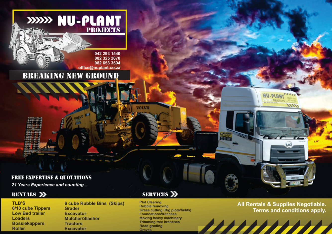"Founded on strong buisness ethics, Nu-Plant Projects delivers results. Through professional service and over 21 years of project experience, we're known throughout the Kouga District as the best for all plant-hire and earth moving needs. Convenience and competitive pricing make us the No.1 choice."